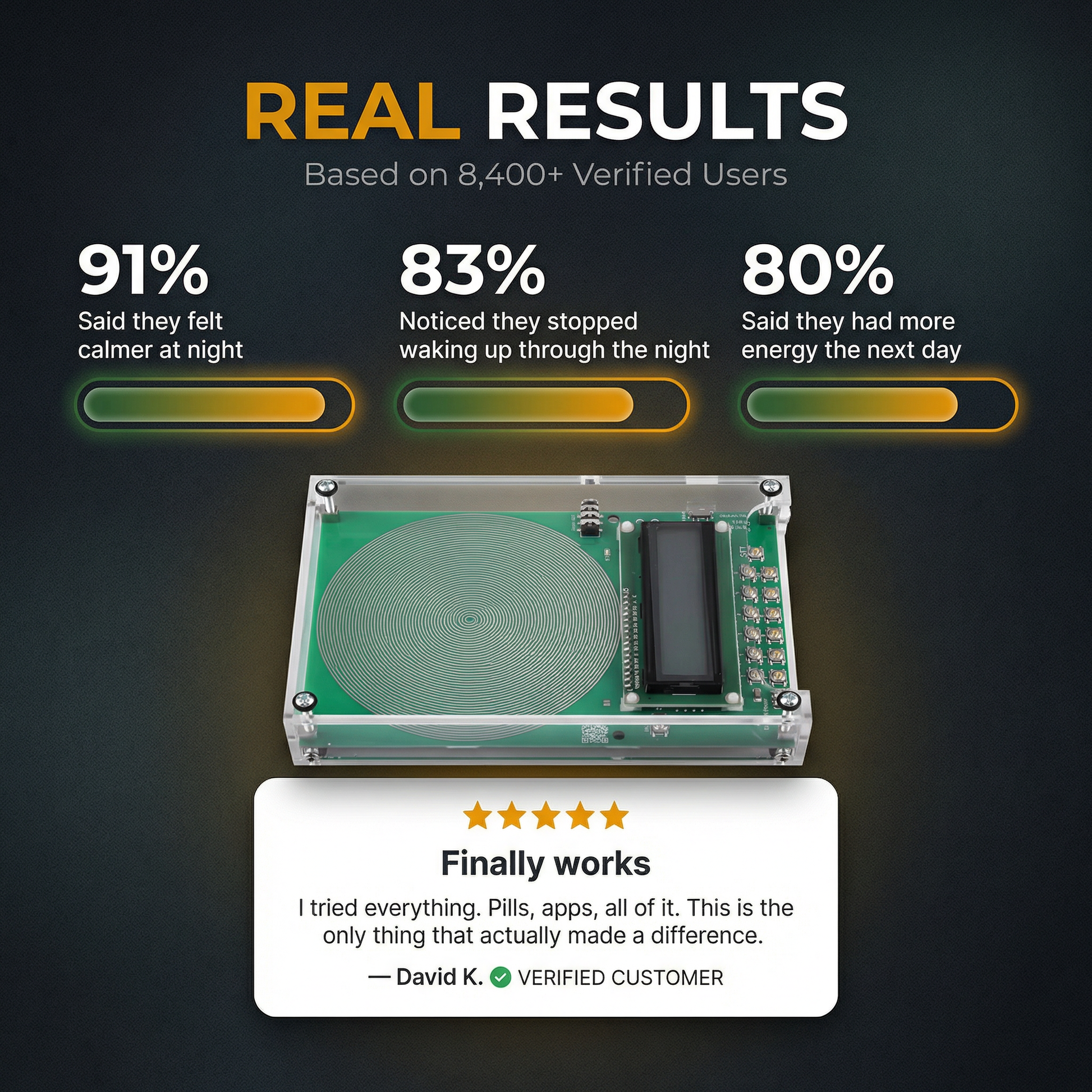 The Truth: Your body isn't broken — it's stuck in a stress loop it can't exit on its own. The 7.83Hz acoustic signal gives your nervous system the exact rhythm it needs to stand down. One customer (Karen, 47, poor sleep for 3 years) said she felt "something release" on night three.