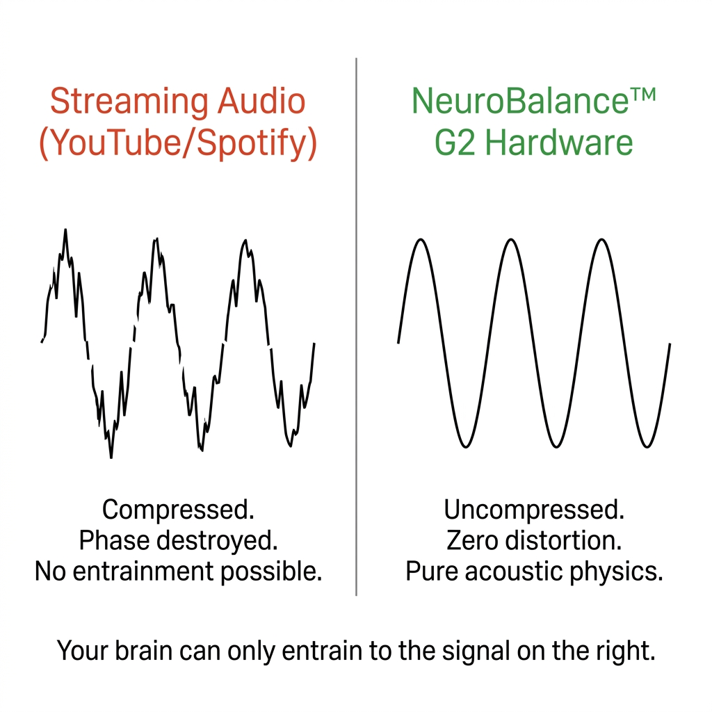 Every audio file streamed on YouTube or Spotify passes through digital compression that strips out the low-frequency phase variations — the exact acoustic precision required to trigger the Frequency Following Response in your brain. It's like trying to smell a photograph of coffee: the information is there, the actual sensory data isn't.
